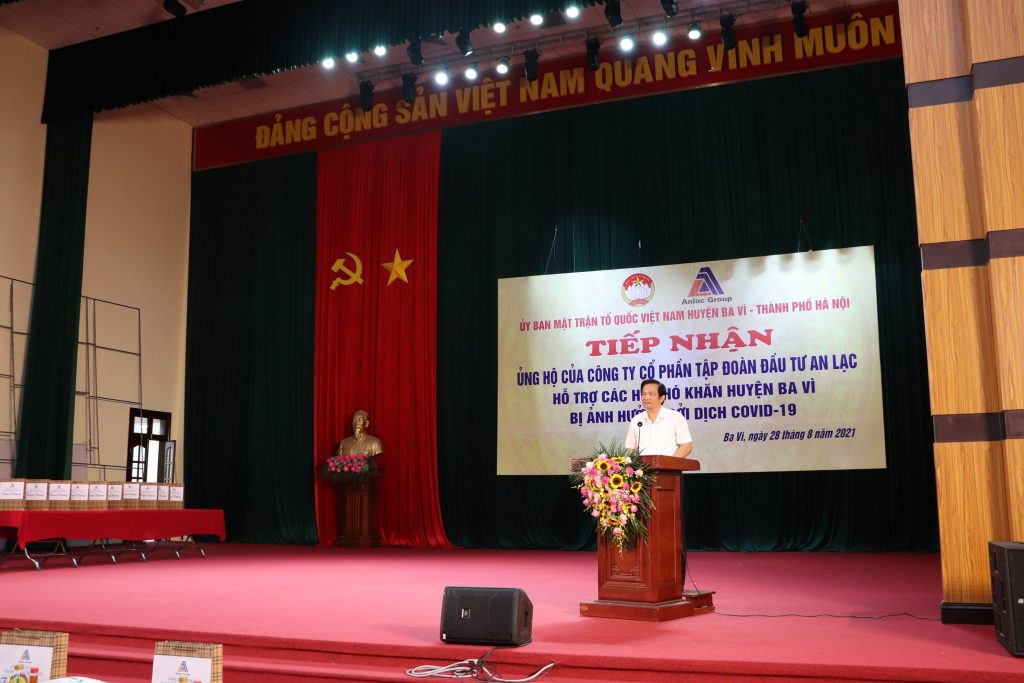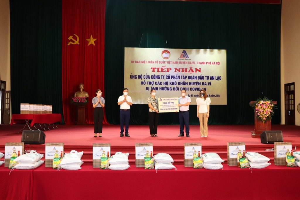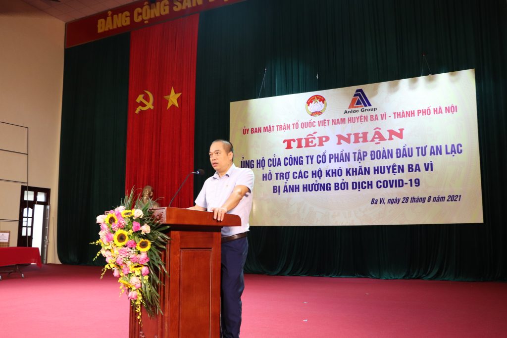 Tại chương trình, ông Dương Cao Thanh – Bí thư Huyện ủy Ba Vì đã gửi lời cảm ơn đến lãnh đạo, cán bộ, nhân viên Công ty Cổ phần Tập đoàn đầu tư An Lạc đã quan tâm, ủng hộ giúp đỡ các hộ có hoàn cảnh khó khăn, bị ảnh hưởng bởi dịch Covid-19 của huyện Ba Vì.