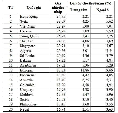 20 quốc gia có chỉ số giá nhà so với thu nhập cao nhất