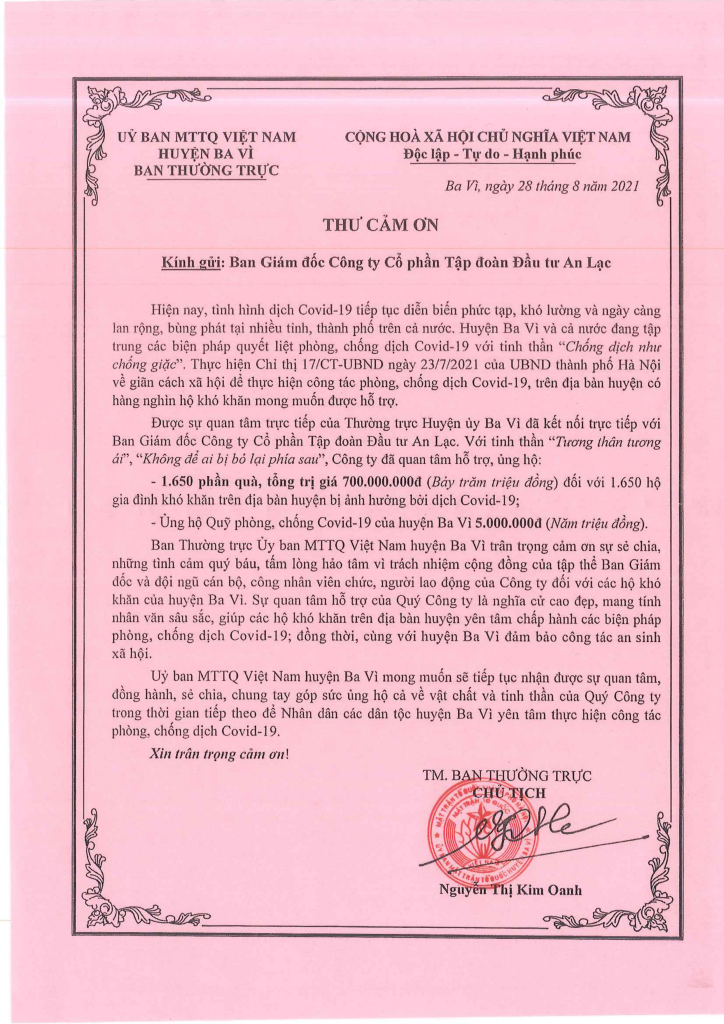 Ủy Ban MTTQ Việt Nam huyện Ba Vì gửi lời cảm ơn tới Tập đoàn An Lạc